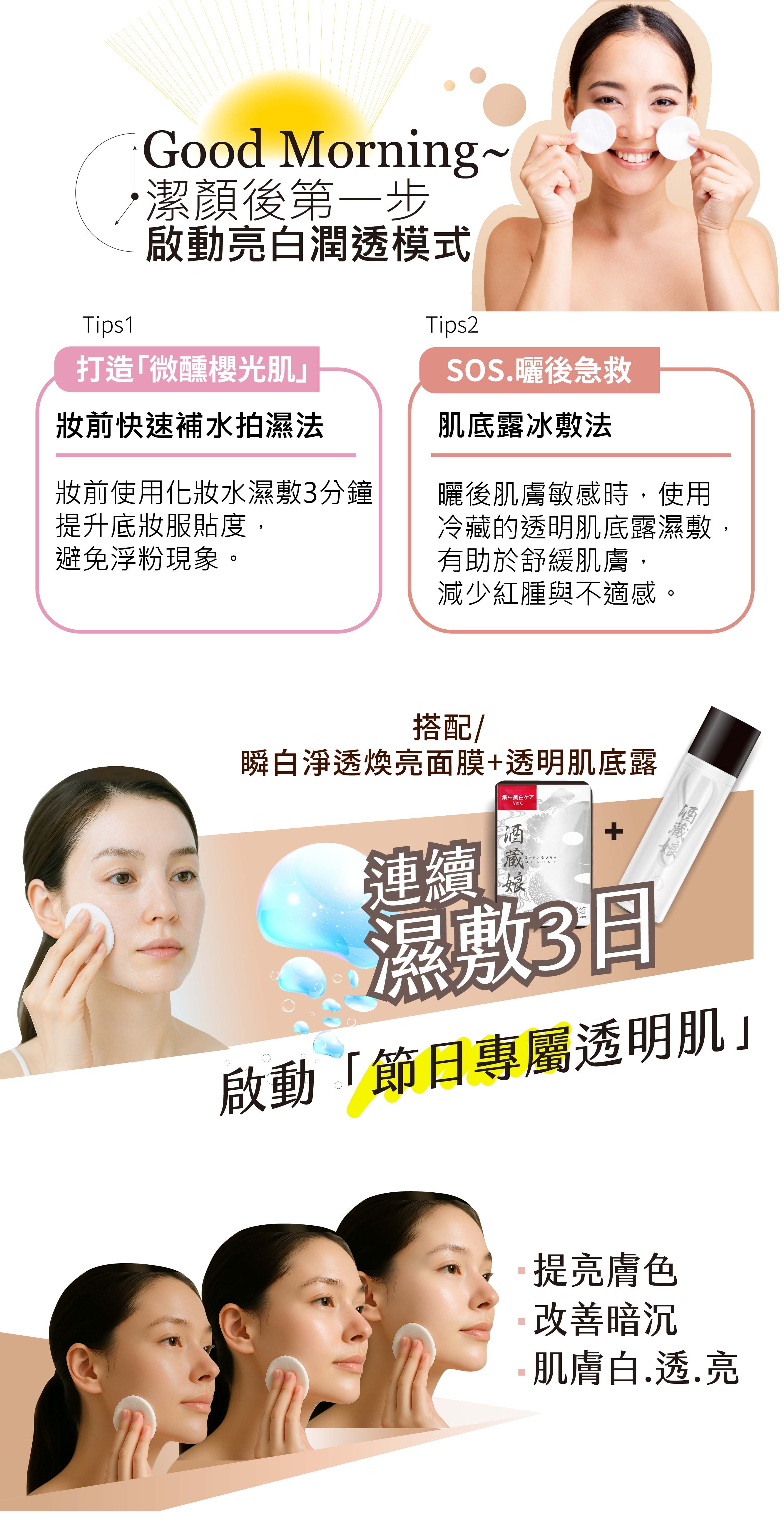 嚴選來自京都「佐佐木酒造」的熟成酒粕精粹與櫻花的四重肌膚調理,濕敷3分鐘,感受肌膚光亮回彈。